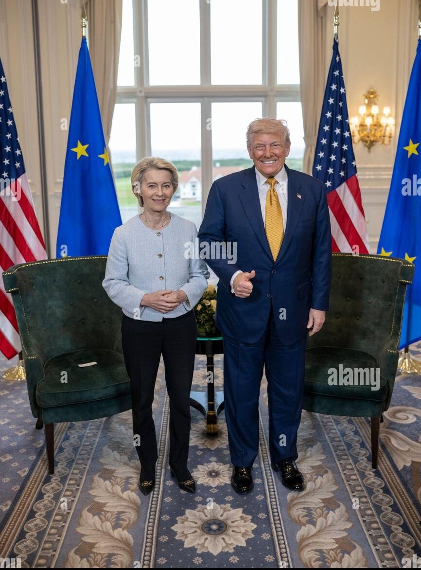 ფოტოსურათზე, რომელიც ივლისის ბოლოს არის გადაღებული, ევროკომისიის თავმჯდომარე ურსულა ფონ დერ ლაიენი თითქოსდა იძულებით იღიმება, გვერდით კი სახეგაბრწყინებული დონალდ ტრამპი დგას, მაღლა აწეული ცერა თითით. ევროკავშირი, ურსულას სახით, ეს-ესაა დათანხმდა დონალდის წინადადებას, რომ აშშ-მა ევროკავშირის ექსპორტზე 15%-იანი ბაჟი დააწესოს, თანაც საპასუხო დარტყმის გარეშე. ფონ დერ ლაიენი და მისი თანამშრომლები იძულებულნი გახდნენ ამ ფრიად არასასიამოვნო ფაქტს შერიგებოდნენ.