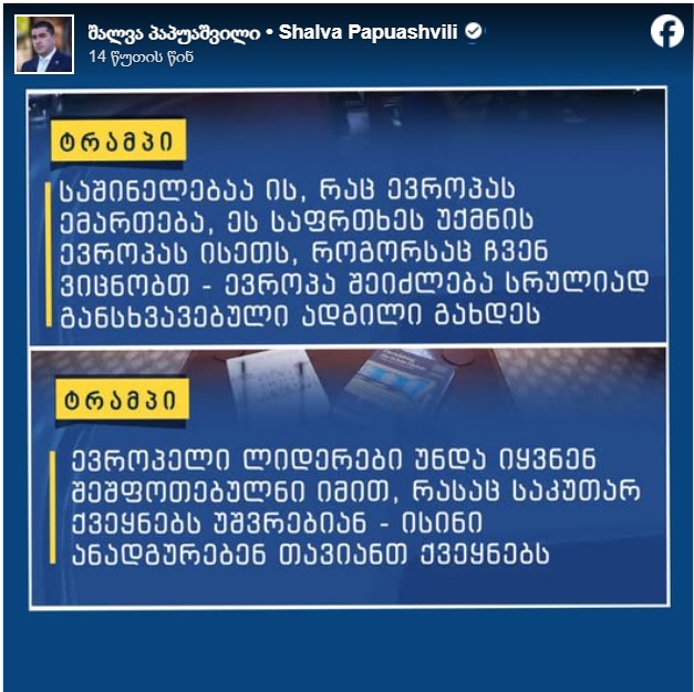 „მნიშვნელოვანია, რომ იმ პრობლემებზე, რომლებზეც ჩვენ ბრიუსელს დიდი ხანია, ვუთითებთ, დღეს უკვე ევროკავშირის მთავარი პარტნიორი და უსაფრთხოების ძირითადი გარანტორი, ამერიკაც საუბრობს. ეს აღარ არის მხოლოდ საქართველოს ხელისუფლების გაფრთხილება – ეს უკვე დასავლეთის შიგნიდან გაჟღერებული განგაშის ზარია, რომელიც ევროპას აფხიზლებს, მოაგვაროს თავსდამტყდარი და სულ უფრო მზარდი, სისტემური და ღრმა პოლიტიკური კრიზისი. ევროკავშირის ლიდერების უპასუხისმგებლო პოლიტიკამ ევროპა ცივილიზაციური უფსკრულის პირას მიიყვანა, იქ, სადაც იკარგება ეკონომიკური სტაბილურობა, ნადგურდება კულტურული იდენტობა და ეჭვქვეშ დგება ევროპული იდეის ღირებულებითი საფუძველი. ევროკავშირი ვეღარ შეძლებს ამ პროცესების იგნორირებას. აუცილებელია მკაფიო პოლიტიკური გადაწყვეტილებები და არსებული მიდგომების გადახედვა“, – წერს პაპუაშვილი.