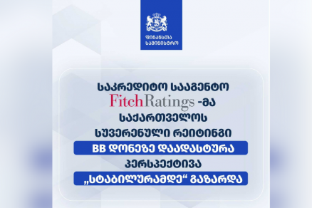 საერთაშორისო სარეიტინგო კომპანია Fitch Ratings - მა საქართველოს სუვერენული საკრედიტო რეიტინგის პერსპექტივა „სტაბილურამდე" გააუმჯობესა. ეკონომიკისა და მდგრადი განვითარების მინისტრის მოადგილის ვახტანგ ცინცაძის შეფასებით, სარეიტინგო კომპანიის მიერ რეიტინგის პერსპექტივის გაუმჯობესება ხაზს უსვამს საქართველოს ეკონომიკის მდგრადობას საგარეო შოკების მიმართ.