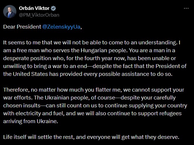 „ძვირფასო პრეზიდენტო, როგორც ჩანს, ჩვენ ვერ შევძლებთ ერთმანეთის გაგებას. მე ვარ თავისუფალი ადამიანი, რომელიც უნგრელ ხალხს ემსახურება. თქვენ ხართ სასოწარკვეთილ მდგომარეობაში მყოფი ადამიანი, რომელიც უკვე მეოთხე წელია, ვერ ახერხებს ან არ სურს ომის დასრულება, მიუხედავად იმისა, რომ შეერთებული შტატების პრეზიდენტმა ყველა შესაძლო დახმარება გაგიწიათ ამისთვის. ამიტომ, რაც არ უნდა მეპირფეროთ, ჩვენ არ შეგვიძლია თქვენი საომარი ძალისხმევის მხარდაჭერა. უკრაინელ ხალხს, რა თქმა უნდა - თქვენი ფრთხილად შერჩეული შეურაცხყოფების მიუხედავად - კვლავაც შეუძლიათ, ჩვენი იმედი ჰქონდეთ, რომ ჩვენ გავაგრძელებთ თქვენი ქვეყნის ელექტროენერგიითა და საწვავით მომარაგებას. ასევე გავაგრძელებთ უკრაინიდან ჩამოსული ლტოლვილების მხარდაჭერას. დანარჩენს ცხოვრება თავად დაალაგებს და ყველა მიიღებს იმას, რასაც იმსახურებს", - წერს ვიქტორ ორბანი.